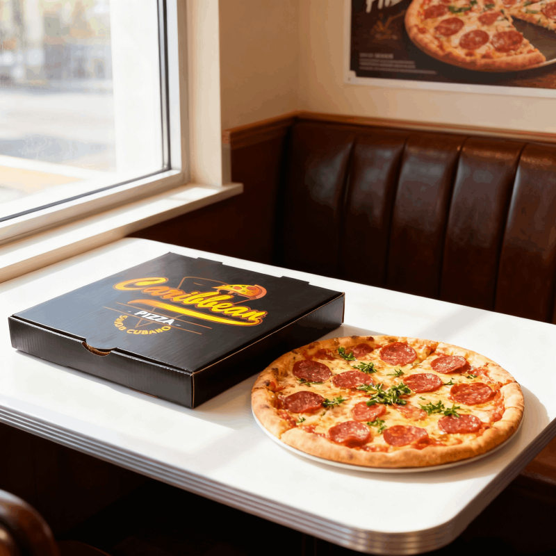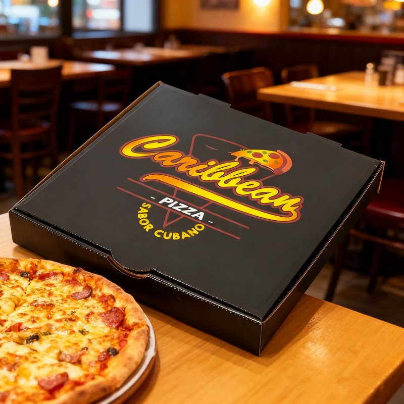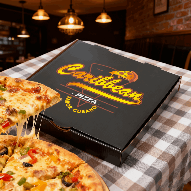 采用食品级黑色哑光涂层卡纸,防油防渗透且可微波加热。盒身压印暗纹LOGO设计,顶部预留透气孔,搭配卡扣式封口。常见为6-18寸,折叠后仅3cm超薄节省空间,支持定制企业LOGO烫金服务。